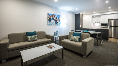 The 3 bedroom apartments sleeps 6 and features 1 King and 4 single size beds, 2 bathrooms (ensuite with shower and bathroom), full entertainment area with a High Definition TV, HiFi system and Blu-ray player, relaxing lounge area with comfy sofas, dining table and fully equipped kitchen including stone benchtops with European appliances and glassware.